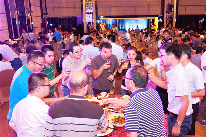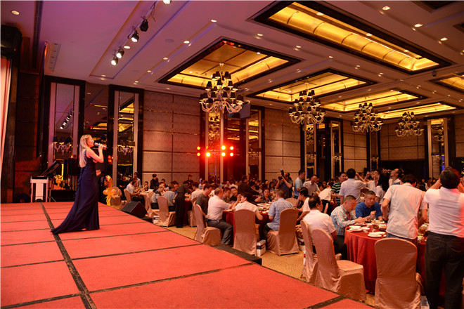 金色八月,熱情似火,有朋自遠方來,逢盛事喜相聚。為了對即將召開的第十屆中國(中山)國際游戲游藝博覽交易會表示熱烈的祝賀,以及對多年來一直關心、支持金馬健康發展的合作伙伴和嘉賓表示誠摯的歡迎和衷心的感謝,8月10日晚,乘著行業盛會的東風,公司在中山喜來登酒店舉行了盛大的客戶招待晚宴。國內外新來客商、嘉賓、媒體記者200余人應邀出席,與公司管理層及員工代表們共同感受了一場精彩紛呈的盛宴,度過了一個充滿歡樂與活力的難忘之夜。
