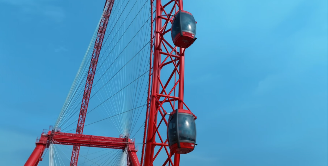 值得關注的是,金馬游樂在該項目上應用了兩項創新技術方案,確保摩天輪的舒適及安全。吊廂伺服調平技術,令每個吊廂在運行中始終處于水平狀態,大幅提升吊掛式轎廂受到風載荷時的平穩性;雙驅動系統獨立運作方案,增強安全冗余,緊急狀況下無高空救援風險。