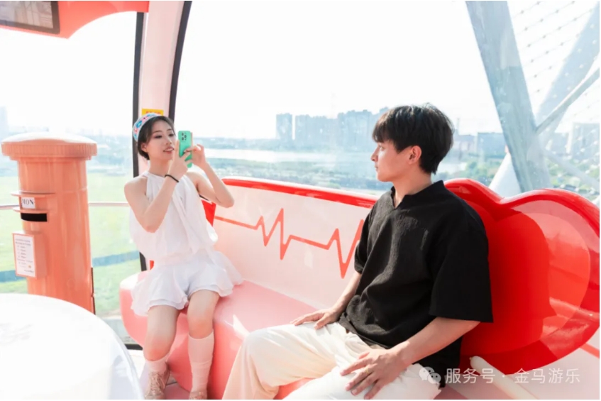 轉(zhuǎn)輪配備36個面積國內(nèi)領(lǐng)先的的橢圓形全景“太空艙”轎廂,單艙面積約6平方米,可容納8-10人,滿載可乘坐352人。艙內(nèi)設(shè)有環(huán)形座椅及中央活動區(qū),滿足全家同乘的寬敞舒適需求。獨特的吊掛式橢圓轎廂搭配360°全透明玻璃幕墻,營造無死角全景視野,游客可盡覽景區(qū)及壯闊長江風(fēng)光,仿佛置身云端,感受城市脈動。艙內(nèi)更融合技術(shù)創(chuàng)新與美學(xué)設(shè)計,打造了涵蓋極地、愛情、童趣等多種風(fēng)格的主題艙,以及驚險刺激的底部透明艙,支持婚禮、慶生、商務(wù)派對等主題定制活動。此外,艙內(nèi)還配備電子屏實時拍照、燈光氛圍調(diào)節(jié)等功能,滿足多元化場景需求。通過以上創(chuàng)新設(shè)計,成功將“楚天之眼”從傳統(tǒng)的觀景設(shè)施升級為多功能社交空間,塑造了武漢文旅新地標。