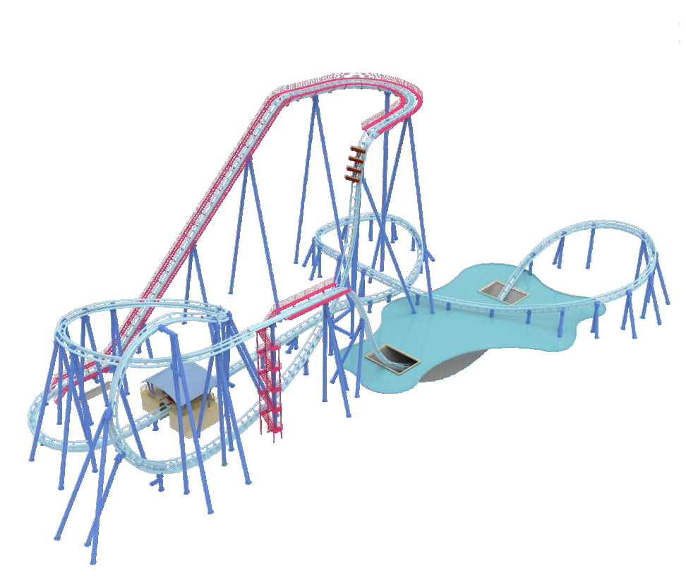 最富有刺激性和挑戰性的大型過山車,設有側傾、盤旋、直線俯沖,陡壁上升,二次垂直跌落,巖洞穿梭、水上沖浪等多種結合;設計形式新穎,游客乘坐過程中可盡情地感受強烈俯沖、失重、側翻和盤旋的驚險刺激感覺,深受青少年喜愛。