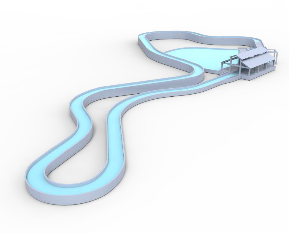 峽谷漂流,筏體經提升系統(tǒng)由站臺提升至水道的高位后,由主泵推動的流水驅動前進。船速由水道形狀決定,通過水底阻水堰的定位設置來制造洶涌的水波,沿途可對水道兩旁進行景觀包裝來制造融入自然的環(huán)境,讓游玩體驗更親近大自然。