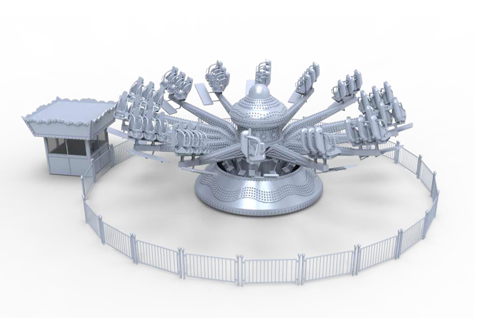 彈跳機中軸為中心帶動周圍十四個座艙繞豎直中軸旋轉(zhuǎn),同時座艙伴隨著音樂進行高低、快慢不同的跳躍式運動。使乘客在過程中體驗到旋轉(zhuǎn)加跳躍的樂趣。
