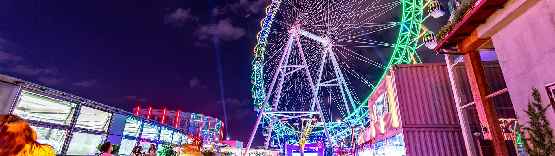 62米觀覽車,塔架由6根立柱構成,轉盤為輻條式,轉盤上均勻分布著36個吊廂。吊廂運作時配以明麗變幻的燈飾,搭配別具匠心的現場配景,以及柔美動聽的背景音樂,乘客在吊箱內平穩悠閑地縱覽周邊美景。