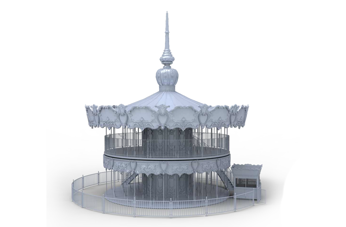 豪華雙層轉(zhuǎn)馬是上、下層可單獨作旋轉(zhuǎn)運動的裝飾豪華的轉(zhuǎn)馬,采用歐洲皇家的古典豪華的裝飾風格。蓬頂?shù)幕使诩馑睕_云宵,天花板、內(nèi)圍板鑲嵌著彩色浮雕,并配備彩燈。馬匹及宮庭式馬車結(jié)合多彩的花飾,造型奢華大氣流光溢彩。