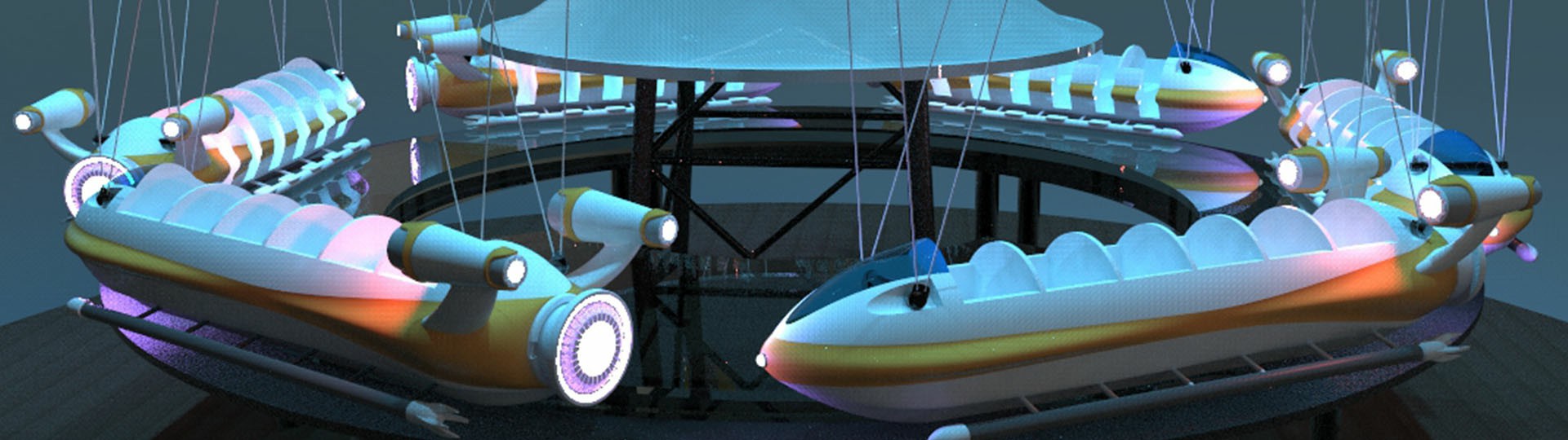 幻速追影六個飛機吊掛座艙隨同旋轉架相對塔體自由旋轉并外擺升起,繞中心立柱飛行,科幻又刺激。夜間智能燈光系統亮起,成為樂園一道的奇趣風景線。