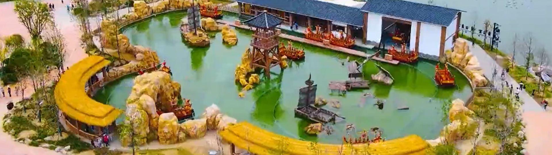 射水戰船是船體自帶超大蓄電池,通過螺旋槳推動船體運行。乘客在乘坐戰船過程中可使用射水槍向其它戰船上的乘客進行射水,也可與周邊游客進行射擊互動。可定制個性化主題造景,增強互動效果。