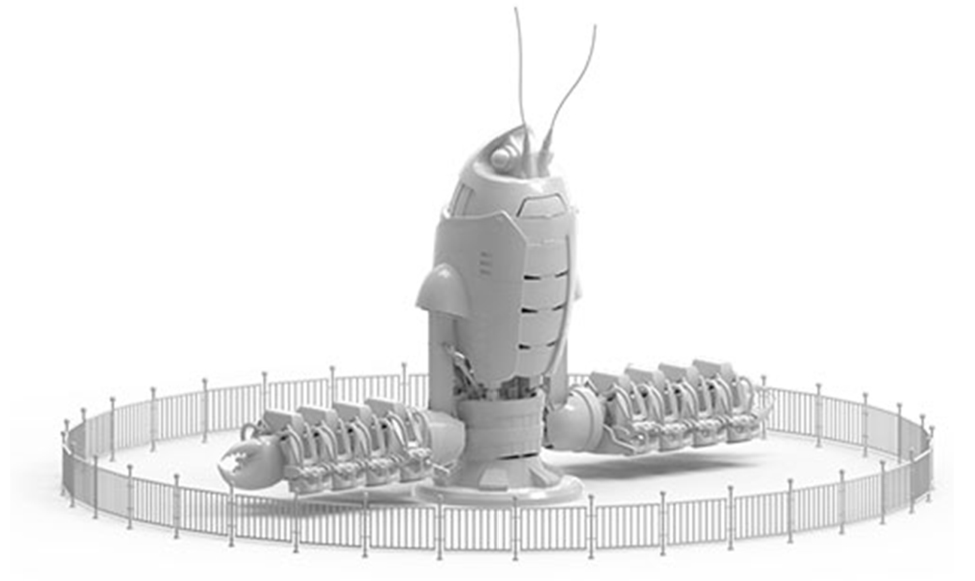 JQJ-16A巨鉗戰甲,設備結構較新穎,體驗感驚險刺激。開始運?時設備主體先上升,上升到?定?度后,進?公轉并伴隨著座艙的?轉和升降臂的升降。整體包裝設計采?機械?蝦造型,標志性的?蝦紅配?加上煙霧、燈光的效果,帶給游客歡樂、刺激的體驗。