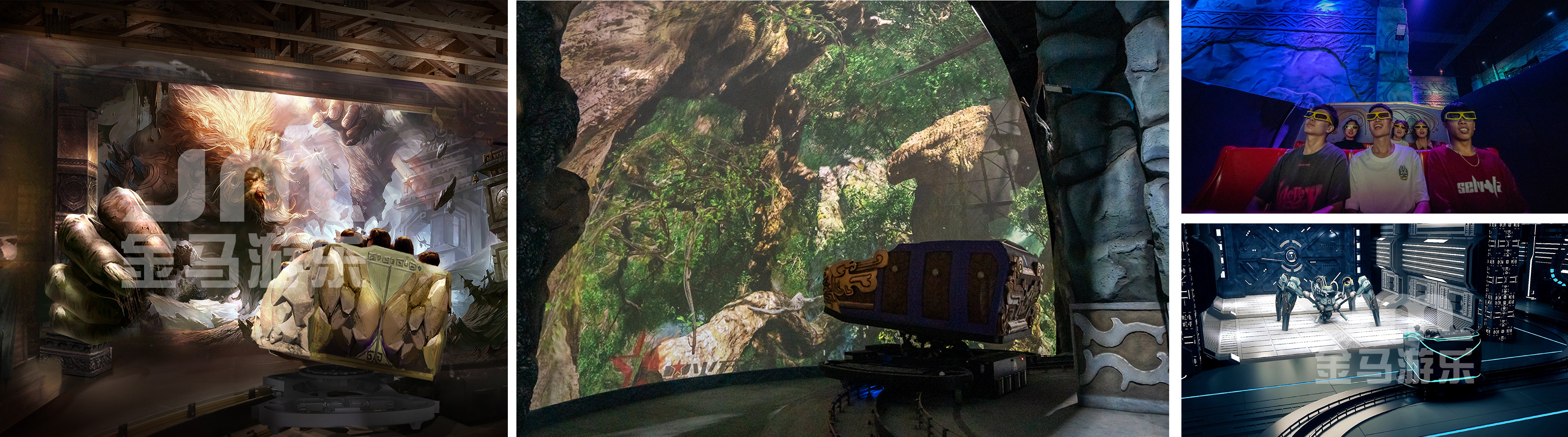 動感黑暗乘騎采用創新型六自由度動感騎乘設備,游客乘坐動感座艙穿梭由主題景觀、高清影片、機模、特效、音效等組成的不同故事場景,是擁有高沉浸感的體驗游樂項目。